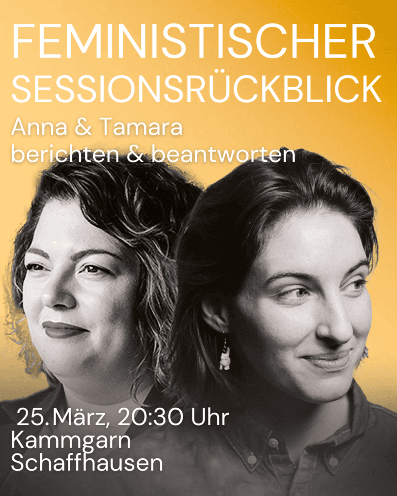 Am 25. März 2026 um 20:30 Uhr findet in der Kammgarn Schaffhausen der Feministische Sessionsrückblick statt. Die Nationalrätinnen Anna Rosenwasser und Tamara Funicello berichten brühwarm aus der Frühlingssession 2026: über Fortschritte, Rückschläge, Aufreger und Aufsteller - immer aus queer-feministischer Perspektive.